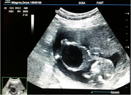 Se trata de paciente femenina de 39 años, sin antecedentes familiares, personales y patológicos conocidos, V gestas, II partos, I cesárea, I aborto, FUR incierta, quien inicia control prenatal durante el primer trimestre del embarazo. El estudio ultrasonográfico reporta imagen anecoica, redondeada, que ocupa pelvis y abdomen fetal (Figura 1).