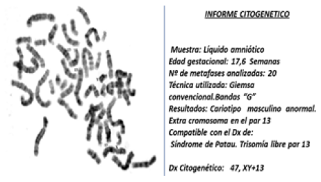 Además, ventriculomegalia, atresia ano rectal, cardiopatía con displasia en ambas válvulas pulmonares, transposición de grandes arterias y miocardiopatía hipertrófica a expensas de ventrículo derecho, que hace sospechar de complejo polimalformativo incompatible con la vida, y se indica interrupción del embarazo. Sin embargo, la paciente decide continuar con la gestación y en nueva apreciación perinatal a las 17 semanas más 6 días de gestación se descarta ventriculomegalia, atresia ano rectal y cardiopatía, no obstante, se aprecia corazón con 2 nódulos ecogénicos en ventrículo izquierdo, riñones con ectasia de 8 mm, megavejiga de drenaje parcial de 90 x 72 x 65 mm con dilatación de uretra proximal (signo de ojo de cerradura) y quiste de cordón umbilical de 29 x 21 mm, realizándose amniocentesis genética que reporta cariotipo 47XY+13 (Figura 2), a la vez se realiza vesicocentesis descompresiva.