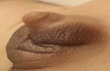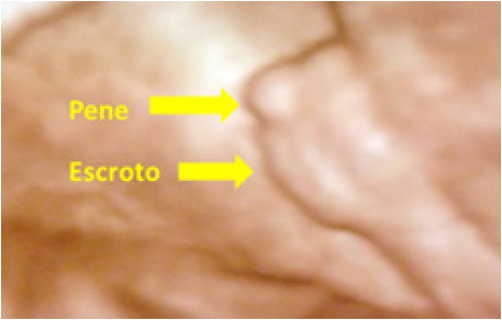 Un continuo control prenatal y en evaluaciones perinatales sucesivas persiste megavejiga de llenado parcial de 44 x 33 mm, de paredes engrosadas, hidronefrosis bilateral (12 mm), micropene (Figura 3), escroto vacío, polidactilia postaxial en manos y onfalocele secundario a megavejiga (Figura 4).
