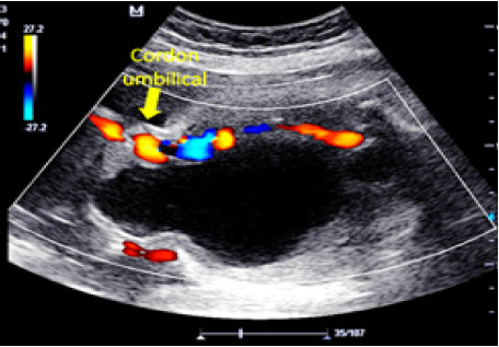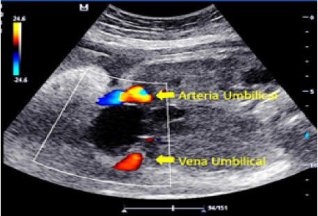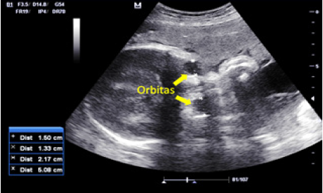 En el tercer trimestre de la gestación es referida a la Unidad de Perinatología de la maternidad de alto riesgo de la Ciudad Hospitalaria “Dr. Enrique Tejera”, donde se evalúa a las 32 semanas de gestación constatando los hallazgos antes descritos además de microftalmia (Figura 5), y arteria umbilical única (Figura 6), se solicita evaluacion prenatal por cardiología pediátrica y la ecocardiografía fetal concluye corazón estructuralmente sano.