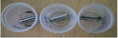 Posteriormente, se agregaron 2100g de suelo natural distribuidas en 1400g primeramente, para luego agregar la pila gastada y finalmente, el resto de la masa de suelo natural, con la finalidad de que la pila quedara en las 2/3 partes de la altura del suelo natural agregado, ya que en la realidad, estos residuos electrónicos al entrar en contacto con el suelo en el ambiente, no están a niveles muy bajos, sino por el contrario, se encuentran generalmente en la superficie o muy cerca la misma.