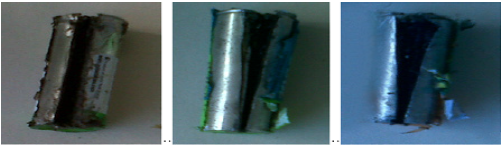 Se consideró que el corte no era suficiente, por lo que se tomó la pila abierta y se colocó forma vertical en la prensa de metal. Con ayuda de la tuerca que permite el abrir y cerrar la prensa de metal, se procedió a fijar la pila en la posición antes mencionada y se ejerció presión para que el corte longitudinal inicial, se expandiera mucho más, permitiendo así una abertura mucho mayor en relación a la realizada inicialmente. De esta manera se logró que la disponibilidad de los metales pesados presentes en las pilas, fuese mayor que aquellas pilas que no han sufrido ninguna degradación acelerada (ver figura 2).