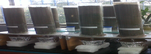 Una vez confeccionadas las siete columnas de percolación, se agregaron 335mL de agua destilada durante 20 semanas. El riego se hizo semanalmente (mismo día) para intercalar ciclos de riego/sequedad de seis días, es decir, las columnas fueron irrigadas siempre los días lunes, muestras que desde el martes, miércoles, jueves, viernes, sábado hasta el domingo se dejaron sin riego, para nuevamente realizar el ciclo de riego/sequedad.