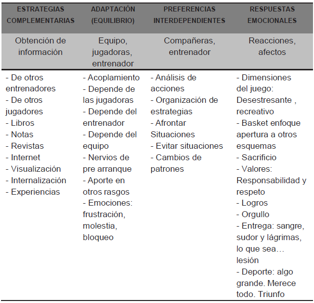En el siguiente cuadro se muestra un epítome de las descripciones tomadas de las entrevistas a las jugadoras de baloncesto. Se presentan como micro niveles donde se reflejan fenómenos sociológicos individuales y de intercambio en estructuras categoriales que le identifican.