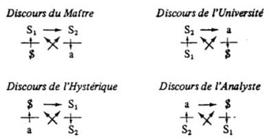 Under the names of Master’s discourse, Hysteric’s discourse, University’s discourse and Analysand’s discourse, Lacan pinpoints four logical discourses which account for a specific type of social tie between two language-traversed beings, each in a particular way. See Figure 1.