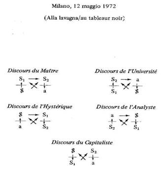In order to stress out the discursive articulations which found and organize social ties, Lacan only proposed four discourses, that can be flipped by 90 degrees, “four structures, not more, the first of which sort of indicates the initial state” (LACAN, 1969-1970, p. 13). However, in the early 1970s, he ventured away from his statements by positing the existence of a fifth discourse. Indeed, to him, discourse structures were not a strictly historical reality. As he wrote in L’envers de la psychanalyse, “they are not the turning table of history. It does not have to happen in the same way, or to spin in the same direction” (LACAN, 1969-1970, p. 217). This is precisely why the capitalist’s discourse, as last in line and as a variant of the Master’s discourse, became an option: in the logic of discourses, what is written keeps being written with.
