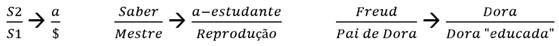 Assim, supomos que o tratamento da jovem Dora é uma tentativa engendrada pelo pai de restituir a filha ao lugar passivo e amoroso com relação ao seu romance com a sra. K. Isto é, Dora entra em análise com Freud já ocupando o lugar de objeto, cuja função seria reproduzir um saber determinado por um professor, que, no caso, seria Freud. Para o pai, o que importava era submeter a filha a um outro lugar no discurso, não mais o de contestadora, mas o de complacente. Como no Discurso do Universitário, o pai de Dora confere a Freud a educação de sua filha, com a condição de que ele a eduque a partir dos seus interesses pessoais. Propomos matematizar o discurso com o qual Dora entra em análise a partir do Discurso do Universitário: