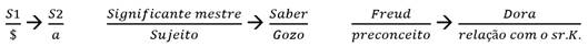 Freud encarna o significante-mestre no discurso histérico de Dora, conduzindo o caso a partir do Discurso do Mestre. Preso a seus preconceitos, Freud não compreendia por que Dora não aceitava a corte do sr. K., visto que era um homem bem-apessoado; ou por que ficava enjoada quando outros homens faziam-lhe galanteios. Para transcender essas questões, Freud teria que escutar Dora em toda a sua singularidade. Contudo, como fazer isso ocupando o lugar de mestre? Tomando o matema do DM, propomos as seguintes substituições para essa primeira leitura: