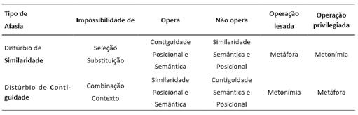 Foi Jakobson quem deu o passo inicial no sentido de elevar a metáfora e a metonímia à categoria de lei geral da linguagem, projeto que tem seu ponto fundamental no artigo Dois aspectos da linguagem e dois tipos de afasias (JAKOBSON, 1956/1969), onde vemos que o autor oscila entre filiar-se a Saussure ou à retórica clássica. Nesse artigo, o autor classifica as afasias em dois tipos: distúrbios da similaridade, que abrangem uma disfunção metafórica, ou distúrbios da contiguidade, que estão ligados à metonímia.