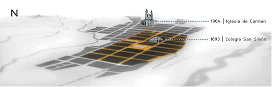 A estas condiciones planimétricas se superpusieron las cronológicas, de modo que se ubicó el colegio nacional de San Simón (1893), la primera obra historicista de estilo neoclásico, frente al parque Murillo Toro, en el corazón de la ciudad colonial, antes de la Guerra de los Mil Días. Luego de la guerra, la primera obra creada fue el claustro San José en 1904, ubicado en la periferia. De estas características surgió la pregunta sobre la anomalía en el desarrollo urbano y estético, pues del crecimiento concéntrico colonial se pasó al lineal republicano, y del neoclasicismo del colegio, se pasó al eclecticismo del claustro (Figura 2).