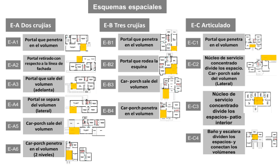 En Esquema E-A se reflejó en seis modelos cuya planta está distribuida en dos crujías longitudinales que establecen una separación entre los espacios públicos y privados de la vivienda. La distribución espacial presenta diversas variaciones de acuerdo al desplazamiento de los locales, la cantidad de habitaciones, la posición del portal o del car-porch, y a diferentes elementos que responden a soluciones formales (formas de la cubierta, presencia de closets explotados como volúmenes sobresalientes de la fachada, desniveles, etc.). Las áreas de estos modelos son generalmente inferiores a las del esquema E-B y E-C. El número máximo de habitaciones es de tres, salvo contadas excepciones. En el Esquema E-B, la planta queda distribuida en tres crujías longitudinales que establecen una separación entre los espacios públicos y privados de la vivienda. Generalmente la crujía del centro contiene el comedor y la sala, y los núcleos de servicios se hallan separados, con más de un baño. En algunos modelos se concibió una habitación de servicio y un pequeño baño en el área de servicio.