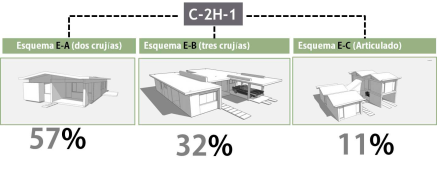 La amplia diversidad de modelos lograda pretendió adecuarse a la variedad de usuarios en función de sus salarios y necesidades particulares. Pero ni la masividad ni la rapidez con que se construyó fueron obstáculos para el despliegue de una gran creatividad, variedad y un alto nivel de diseño, respaldado por una buena calidad de la ejecución (Figura 11). Básicamente las viviendas se desarrollan a partir de tres esquemas fundamentales según su distribución espacial, sus relaciones con el espacio exterior y la superficie útil: 1. Esquema E-A (dos crujías); 2. Esquema E-B (tres crujías) y 3.Esquema E-C (Articulado) (Figura 12)