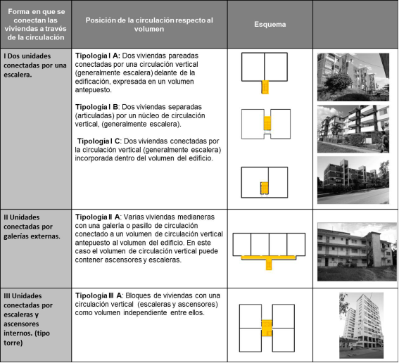 Para acometer el estudio, se tomó la clasificación teórica de los posibles tipos de edificios, de acuerdo a la forma de agrupar las viviendas, en torno a la circulación vertical de aplicadas en anteriores investigaciones 12 y adaptadas el estudio del INAV (Figura 14).