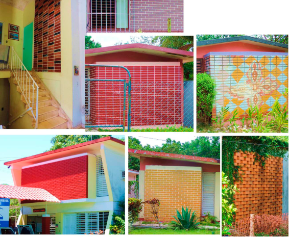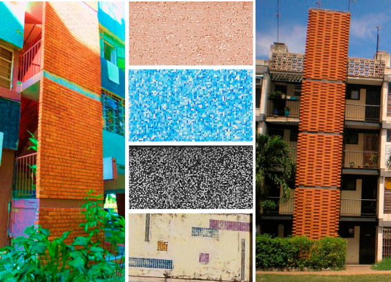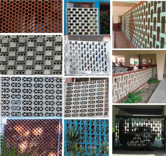 En las obras se mantuvo una continuidad en el uso de los diferentes materiales y la intención a través de ellos de lograr ambientes y texturas diversas propias del Movimiento Moderno cubano. Se emplearon materiales no estructurales como ladrillos y piezas cerámicas como revestimientos interiores y exteriores, también se dejaron a vista bloques de mortero para enfatizar zonas de la vivienda como el portal. (Figura 16) En las viviendas son recurrentes los revestimientos de ladrillos y en los edificios, mosaicos cerámicos de azul, ocre y beige debajo de los vanos además de una amplia y creativa gama de cierres de celosía para los patios de servicio. (Figura 17).
