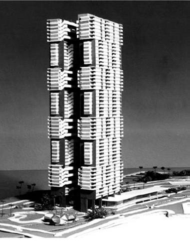 Más hacia el este en los terrenos de Alamar se quiso erigir el Edificio Libertad de 50 plantas, para lo que fue convocado un concurso el cual el primer premio quedó desierto, el segundo lo alcanzó la propuesta de los reconocidos y prestigiosos arquitectos, el cubano Ernesto Gómez Sampera y el español Martín Domínguez, proyectistas del Edificio Focsa. 14 Su propuesta creaba un soporte público en una amplia parcela, del que emergían las torres con una planta en H, conectadas por galerías. Formalmente, se iban agrupando unidades de 6 plantas de altura, donde las variaciones tipológicas se expresaban al exterior, generando un ritmo que fragmentaba la rotundidad del volumen. (Figura 20).