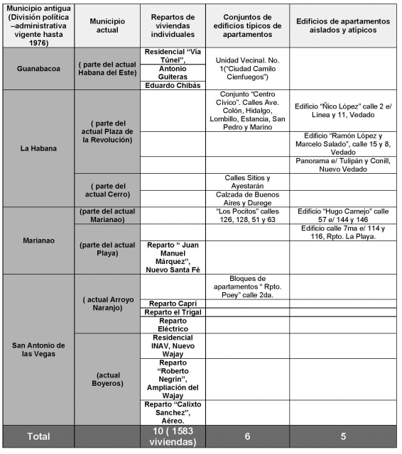 A partir de un inventario previo extraído de las mencionadas memorias económicas del INAV de la obra del instituto en La Habana realizado en el año 2014 se identificaron 1583 viviendas y 3026 apartamentos. 2 (Figura 3) Se partió del 100 % del universo, y en una etapa posterior, se redujo tomando en consideración de qué obra existían planos y evidencia gráfica o física de las realizaciones, lo cual fue vital para la caracterización, y se desestimaron aquellas que fueron terminadas por el INAV, pero no diseñadas por el organismo, como por ejemplo el edificio “Hermanas Giralt” ubicado en 23 entre D y E, Vedado. La obra había sido iniciada por la Cía. Vazarta Territorial, S.A en 1958 y diseñado por el arquitecto Oscar Fernández Tauler. Este edificio fue asumido por el INAV, en enero de 1960, cuando ya tenía construida la estructura. Tampoco se incluyó en la muestra analizada el reparto El Trigal, en el municipio de Arroyo Naranjo al sur de la ciudad, perteneciente al Retiro Harinero, en el que se habían construido desde finales de los cincuenta un total de 140 viviendas, aún sin terminar, entre otras de las que se hizo cargo el INAV de su adjudicación, 3 ni dos viviendas dúplex pareadas ubicadas en 116 esq. 37, Marianao, modelo único en todo el país, y otras obras en la ciudad en que el organismo solo realizó reformas, o las terminó. (Figura 4)