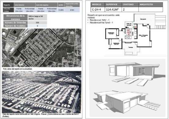 Se trabajó con los planos de cuatro urbanizaciones y de casi la totalidad de los modelos de viviendas y edificios localizados en la ciudad. También se contó con información gráfica del antiguo Ministerio de Obras Públicas lo que permitió relacionar las obras con sus planos correspondientes y se elaboraron 82 fichas, (9 de repartos, 41 de viviendas y 21 de edificios de apartamentos).(Figura 5) que contienen la información de los aspectos urbanos y arquitectónicos, los arquitectos responsables, esquemas tridimensionales y plantas digitalizadas a partir de los planos que permiten apreciar los diseños originales, pues en la actualidad muchas de las realizaciones han sido transformadas.