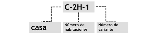 Tanto las viviendas aisladas como los edificios de apartamentos, fueron clasificados y nombradas con letras y números según la cantidad de habitaciones por el Instituto (Figura 9) Se diseñaron ocho variantes de viviendas de dos habitaciones, (aunque también existen modelos con otras combinaciones de letras), treinta de tres habitaciones y cuatro para las de cuatro habitaciones. 8
