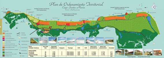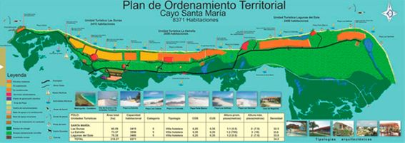 Sin embargo, realmente el ordenamiento de cayo Santa María se aprueba en el año 2004 con un potencial habitacional de 8 706 habitaciones, cuando se presenta el Plan General de Ordenamiento Territorial (PGOT) al Comité Ejecutivo del Consejo de Ministros (CECM), luego de una Evaluación Estratégica Ambiental (EEA) con recomendaciones y límites de capacidad de carga. Este Plan fue aprobado, en esta instancia para su implementación inmediata basado en un riguroso cumplimiento de las regulaciones y medidas resultantes de este proceso, por lo que este ordenamiento constituye en lo adelante la legislación oficial por la cual se regirá el desarrollo del turismo de la región, de obligatorio cumplimiento para todo inversionista presente en el territorio, 3. (Figura 3) Este plan reforzaba desde su aprobación en documentos conjuntos por la Dirección Provincial de Planificación Física y el CITMA en el territorio de la provincia de Villa Clara los mismos elementos o criterios de partida para por sobre todo preservar el ecosistema y lograr un desarrollo del turismo armónico y en correspondencia con los enfoques de sustentabilidad.