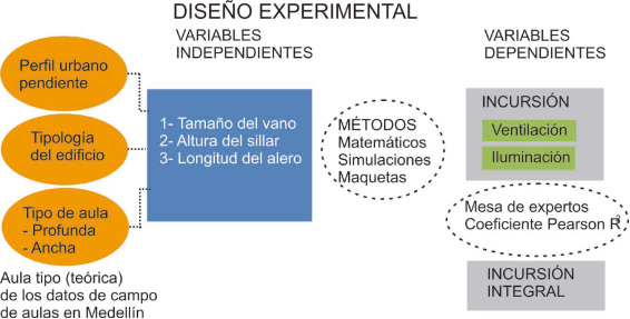 A partir de la definición de estas variables se construyó el modelo teórico de un aula, el cual sirvió para estudiar el comportamiento combinado de la iluminación y la ventilación, mediante la aplicación de procedimientos de cálculo y de modelación. Los resultados obtenidos a través de ambos procedimientos se integraron a partir de la aplicación de métodos cualitativos de ponderación. Finalmente, para demostrar la validez de los hallazgos se aplicaron pruebas estadísticas de correlación.