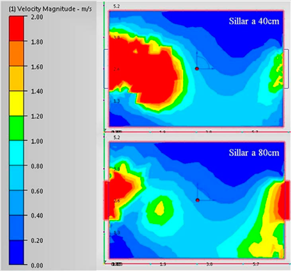 Los resultados de la velocidad del viento en el interior de las aulas de los jardines infantiles se deben complementar con simulaciones por computador que permiten evaluar los patrones de propagación del aire y la cantidad del área del aula que esta ventilada. El aula definida en el modelo teórico se simuló en el programa CFD. La Figura 10 presenta los resultados de la distribución del viento en un plano paralelo al piso del aula a una altura de 40cm. Se entiende por área ventilada aquella que tiene velocidades por encima de 0,3 m/seg.