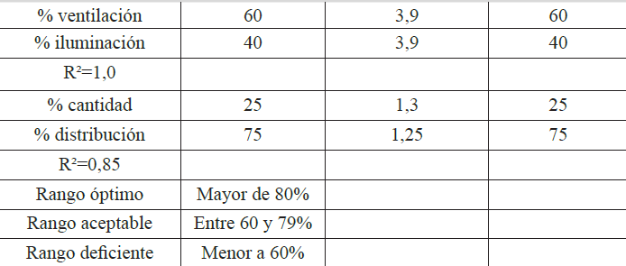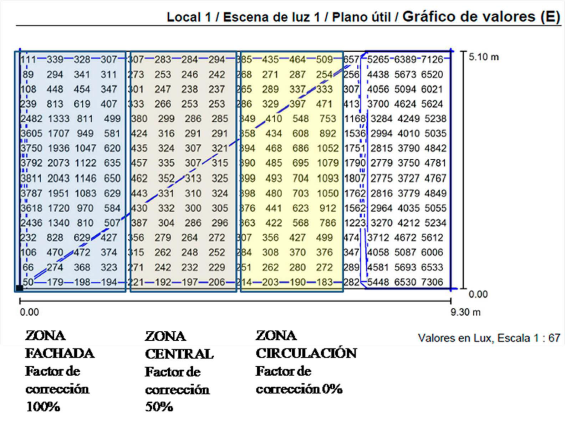 La norma ISO 8995 20 recomienda para las aulas un rango de iluminancias entre 300 y 700lx, a una altura de 70cm del piso. Con las simulaciones realizadas en Dialux 4.12 se identificó que para un plano de trabajo a 40cm los rangos se aumentan entre 200 y 1200 lx, por lo que se establecen los siguientes rangos de valoración de las iluminancias: Óptimo para un rango de la norma entre 300 y 700 lx, aceptable para un rango obtenido de las simulaciones a 40cm del piso entre 200 y 1200 lx y deficiente para los rangos que excedan más de 1000 lx de diferencia entre las iluminancias.