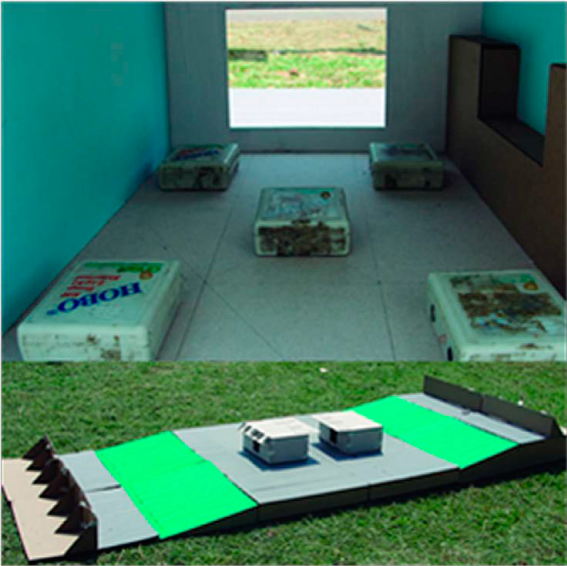 Para controlar los resultados de las simulaciones se construyeron maquetas a escala 1:20 que reproducen las condiciones de los perfiles urbanos tipo 1 y 2 y el cielo de la ciudad. La Figura 12 muestra los modelos y la localización de los sensores, dataloger calibrados.