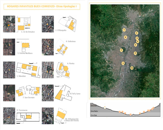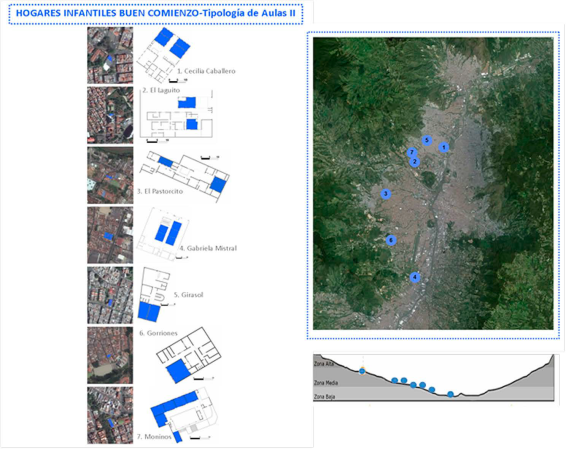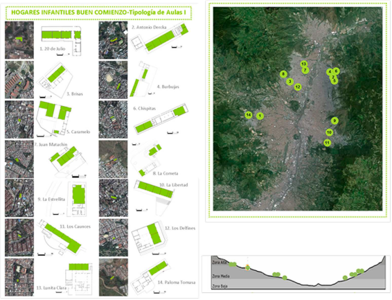 En Colombia las políticas educativas de los años sesenta se concentraron en aumentar el número de aulas para cubrir la demanda de los niños que venían del campo a la ciudad y se asentaban en barrios informales y de crecimiento urbano no planificado. Las escuelas de la época se ubicaron en lotes pequeños, con sistemas constructivos de baja complejidad: mampostería en ladrillo, techos de tejas de fibrocemento, aulas de planta cuadrada y ventanas pequeñas a un metro de altura del piso. En esas escuelas de Medellín no había aulas específicas para los niños del jardín infantil y por lo general se utilizaban espacios sin ninguna adecuación particular. Estas escuelas se alejaron de las propuestas pedagógicas de Froebel 1, Montessori 2 y Decroly 3 quienes proponían aulas para jardines infantiles abiertas, ventiladas e iluminadas, con la posibilidad de acercar a los niños a la naturaleza y el barrio.
