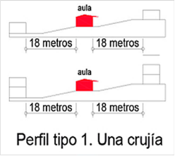 Con los perfiles urbanos determinados anteriormente, se procedió a definir el modelo teórico de un aula: Los 44 edificios evaluados tienen 176 aulas, el 68% de ellas tienen planta rectangular, 22% de planta cuadrada y el 10% restante con otras formas en planta. Las aulas rectangulares tienen una proporción promedio entre el ancho y el largo de 1 a 1,5 veces. El 57% de ellas tienen los vanos en la fachada más corta, y se denominaron aulas profundas, mientras que el 43% restante tienen los vanos en la fachada más larga, denominándose aulas anchas.