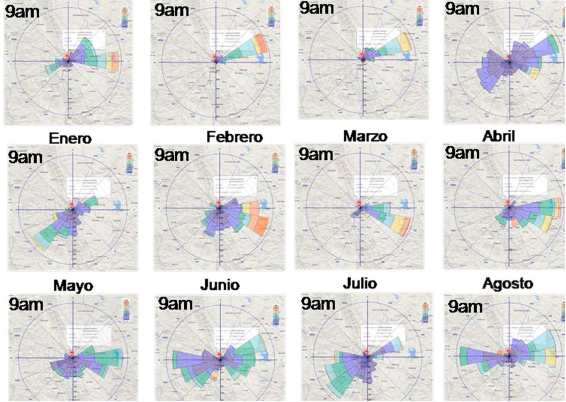 Medellín está ubicada en un valle alargado de norte a sur, entre los 1500 y los 2000msnm, con un clima promedio entre los 18ºC y los 29ºC y humedades relativas promedio entre 40% y 70%.3 Por las características del relieve los barrios se asientan en las laderas este y oeste en las que el viento por convección asciende y desciende. La figura 8 muestra el comportamiento del viento en la estación meteorológica San Javier a 1800 msnm 14 en la que se observa que todas las direcciones provienen desde el este u oeste, direcciones que coinciden con la orientación de las laderas del valle: