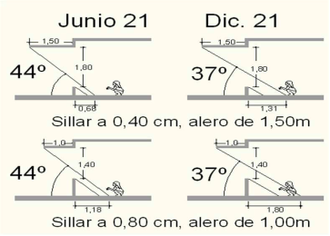 Con alturas de los sillares a 40cm y 80cm y la trayectoria solar para Medellín, latitud 6,25ºN, se requiere del control solar para las fachadas orientadas a este y oeste, que deben obstruir ángulos de altura solar entre 37,5º y 44º para las 9;00 am y 3:00 pm en diciembre y junio respectivamente. La relación geométrica entre altura de sillar y ángulo de altura solar es (Figura 8):