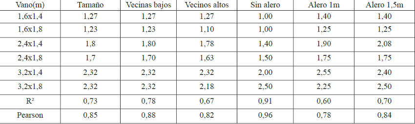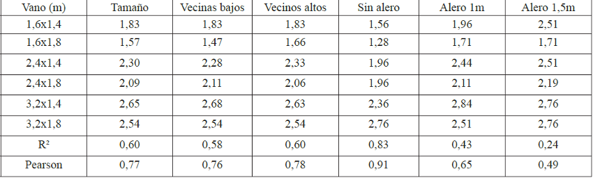 Con respecto al tamaño de los vanos todas las combinaciones analizadas muestran una relación R2 por encima de 0,59 que se puede interpretar como aumento de la eficiencia de la incursión con el aumento del área del vano. Cuando se revisan los resultados por tipología de aula, los valores promedio de R2 son 11% más altos para las aulas profundas que para las aulas anchas, todos valores por encima de 0,59. Cuando se analiza por perfiles urbanos el perfil 1, de vecinos bajos, presenta un R2 10,5% más alto que el perfil 2. En ese sentido el valor R2 más alto es para las aula profundas en el perfil 1 (0,73).