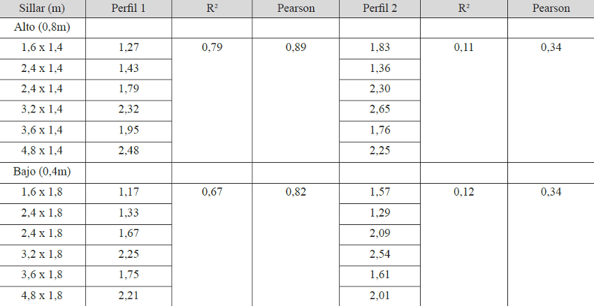 En cuanto a la altura del sillar, el comportamiento de la incursión se relaciona de manera alta y positiva con el perfil 1, con un promedio de R2 de 0,73 contra un R2 promedio para el perfil 2 de 0,115, lo que indica que la altura del sillar nada tiene que ver con la eficiencia de incursión integrada.