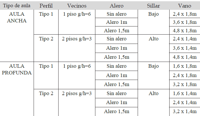 La Tabla 2 muestra las combinaciones de análisis de los 12 vanos según el perfil urbano, la altura de los edificios vecinos, el tipo de aula, la altura del sillar y la longitud del alero.