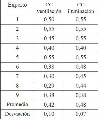 Se preguntó a los expertos sobre: 1. La calificación en porcentaje que tiene la ventilación y la iluminación en un aula para un jardín infantil. 2. Porcentualmente qué valor tiene la cantidad de viento e iluminación que ingresa al aula sobre la distribución de los mismos en el aula. 3. Cuáles son los rangos para calificar las incursiones en términos de óptimo, aceptable y deficiente.
