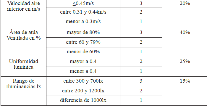La investigación estuvo limitada por la forma del aula, los tipos de perfiles urbanos, el ángulo de incursión del viento, variables que pueden dar mayor precisión a los resultados obtenidos. Los expertos tuvieron coincidencia en las valoraciones y los argumentos para otorgar menos importancia porcentual a la iluminación, ya que es susceptible de ser controlada por la iluminación artificial y los acabados del aula, lo que no ocurre con la ventilación. Advierten que las valoraciones pueden tener variaciones cuando se trata de aulas para otros grupos de edades, lo que indica el valor que los expertos le otorgan al usuario para adecuar las condiciones de los espacios.
