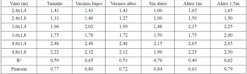 Según los objetivos declarados, el primer análisis corresponde a la relación entre las características de los vanos estudiadas (tamaño, altura de sillar y longitud del alero) y la incursión integrada.