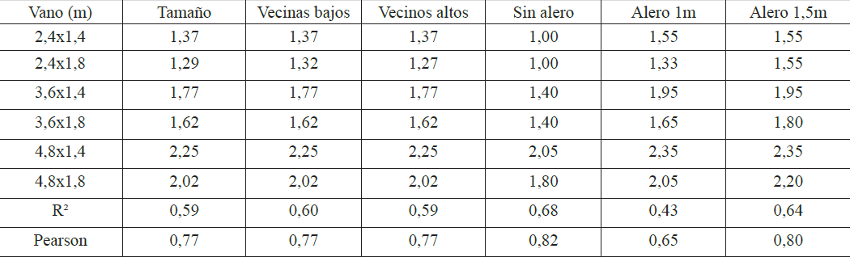 Con respecto a la longitud del alero el comportamiento de las incursiones es inconsistente pues mientras para el comportamiento de los vanos sin alero es alto y positivo con un R2 promedio de 0,78, para los aleros de 1m de longitud el valor R2 promedio cae a 0,46 y se vuelve a elevar para los aleros de 1,5m con un valor promedio de 0,55. Cuando se discriminan los resultados el comportamiento más alto y positivo promedio es para los vanos sin alero en aulas profundas y ambos perfiles. La relación absoluta más alta es para el aula profunda sin alero en el perfil 1, R2=0,91.