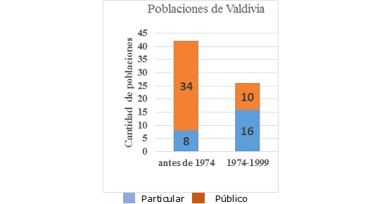 La construcción de estas nuevas urbanizaciones no fue realizada mayoritariamente por el Estado. Por el contrario, el sector privado, formado por empresas particulares y cajas de ahorro, fueron los principales impulsores de esta expansión habitacional. En este punto, se vio un giro en el desarrollo de la ciudad, y hasta el día de hoy, el sector privado es una fuerza importante en el crecimiento urbano. Este vuelco al sector privadose evidencia en el trabajo de Borsdorf, quién realizó una comparación sobre los tipos de poblaciones en Valdivia construidas antes del año 1974 y entre 1974-1999, clasificándolas en dos grupos: particulares o públicas, siendo las primeras desarrolladas por el sector privado y las últimas por el Estado (Figura 10). Estas cifras corroboran una de las hipótesis de esta investigación, que con el término del gobierno de la Unidad Popular6 y sumado a la implementación del libre mercado durante la dictadura militar7, la actividad urbanística se trasladó fuertemente al sector privado.