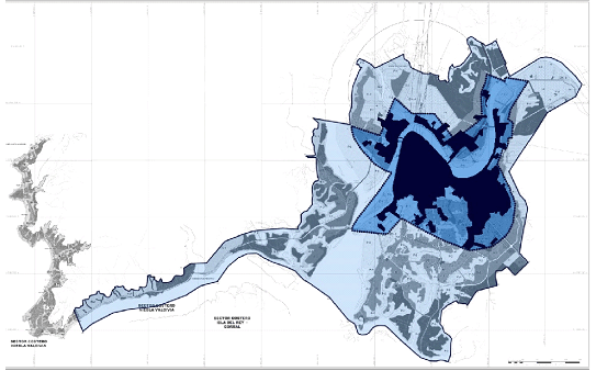 El terremoto de 1960 redescubrió el antiguo plano porque en estos lugares apenas se mantuvo en pie casa alguna” 18. El terreno descendió aproximadamente 1,70 metros, lo que hizo variar las condiciones de habitabilidad de extensas zonas urbanas pobladas, especialmente por comunidades pertenecientes a los estratos socioeconómicos más bajos, hecho que generó la nueva morfología que Guarda denota. (Figura 6)