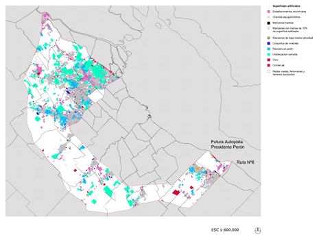 El análisis cuantitativo se circunscribe al área comprendida entre la ruta N°6 y la futura Autopista Presidente Perón. Dentro de este marco espacial se estudia la distribución de los usos artificiales en 2012 a partir de la información digital brindada por google maps y tomando como referente el estudio de usos reales de suelo que realiza por el Ministerio de Infraestructura de la Provincia de Buenos Aires en 2004 (figura 1).