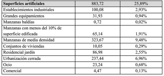 Los usos artificiales se reparten a lo largo de más del 25,89% del espacio de I-UR, con presencia destacada de "manzanas de baja densidad" -superior al 9% de la superficie- y de "urbanizaciones cerradas" -por encima del 6%-, le sigue en menor proporción el uso "residencial jardín" -por encima del 2%-, "establecimientos industriales" -por encima del 2%- y "manzanas con menos del 10% de superficie edificada" -por encima del 1%-. El resto de los usos dentro de esta zona poseen una presencia inferior al 1% (Tabla 1).
