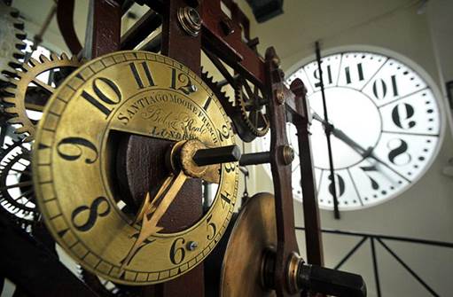 En el segundo, el tiempo pasa a ser propiedad del comercio y del trabajo. [10] La medición del tiempo se convierte en un problema laico acuciante que demanda la aparición de sistemas más fiables que las campanas del clero; aparecen entonces los relojes mecánicos. Es necesario tener en cuenta que, dialécticamente, las torres de las iglesias van remplazando sus campanas por relojes, tal como se ve en la propia basílica de San Pedro en el Vaticano. Este proceso histórico ligado a la realidad de la vida económica queda subrayado por el enunciado axiomático de Benjamín Franklin en 1748: Time is money, Tiempo es dinero. [11] En lo urbano arquitectónico, la posesión de un reloj público confiable y estéticamente agradable se convierte en parte de lo que evidencia estatus, como muestra están Praga, Londres o Munich, pero sobre todo existe una urgencia real, a nivel productivo, por unificar la medición del tiempo para concomitantemente convertir este metraje en valoración contable. Medir el tiempo, medirlo correctamente, es, por lo tanto, sinónimo de progreso.