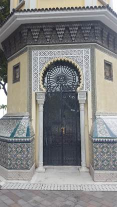 Para la primera pregunta basta examinar los elementos formales que se presentan a la vista: la composición a partir de un octógono irregular -cuatro caras más anchas y cuatro menores- en planta concuerda con la de los alminares españoles, tal como lo reseña Pavón Maldonado y pone como ejemplo a la mezquita aljama de Madinat al-Zahra [12]. El vano de entrada jerarquizado por un arco en herradura polilobulado enmarcado en alfiz con albanega llena con ornamentos geométricos trabajados en un solo color. (Figura 5). El piso bajo parte de un zócalo cubierto de azulejos con patrón girih que repite el diseño con un centro desde el que se proyectan cuatro elementos simétricamente hasta formar un panel de 16 formas idénticas, y está demarcado en la parte superior por un pequeño alero sostenido por ménsulas con acento mocárabe que se repiten en la cornisa superior. (Figura 6).