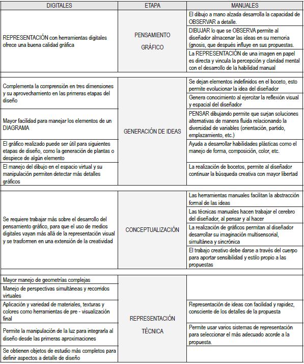 Como parte de los resultados, se presenta el siguiente cuadro comparativo entre las ventajas de las técnicas manuales y digitales en las etapas de los procesos creativos del estudiante de arquitectura. (Tabla 1)