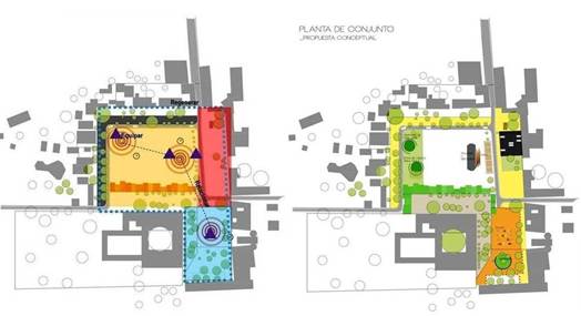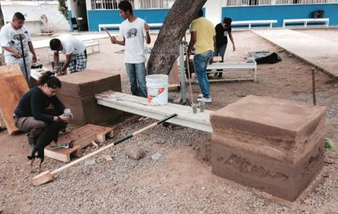 Se realizaron tres propuestas sobre los espacios seleccionados: a) Reutilizar llantas de desecho para generar bancas en el área deportiva, b) Unir dos viguetas prefabricadas apoyadas sobre un marco de metal que sirviera como base (mobiliario no fijo) para reubicarse acorde a las necesidades, c) Unir tres viguetas con la posición original invertida para mejorar su ergonomía, generando dos bancas unidas con tres bases hechas de tapial (mobiliario fijo).