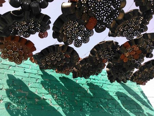 Otra actividad desarrollada en el lugar fue el acondicionamiento de un patio que fungiría como espacio vestibular de acceso y como área social del centro comunitario. El trabajo consistió en el diseño y la colocación de una techumbre que diera sombra al patio. Para ello se utilizaron macetas de plástico que fueron donadas.