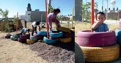 Otro proyecto consistió en la creación de un área recreativa, a partir de la reutilización de materiales de desecho. En este caso, se contó con la colaboración de habitantes de la comunidad para la limpieza del terreno. Otras acciones realizadas en el lugar fueron la colocación de arriates para la protección de árboles, mediante el uso de llantas, así como un área de juegos infantiles, todo lo cual permitió aprovechar temporalmente el sitio para la convivencia y el esparcimiento. (Figura 4)