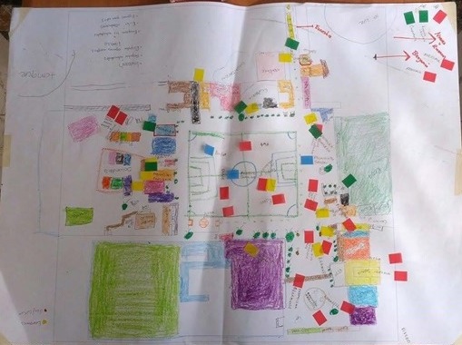 Momento 2. Se presentaron los resultados del diagnóstico en un un taller público. Posteriormente se realizaron dos talleres comunitarios de retroalimentación. Uno se basó en la aplicación de técnicas de dibujo (Figura 8) y otro de maquetas (Figura 9). Ambos talleres permitieron establecer de manera gráfica las actividades potenciales que se pudieran desarrollar, así como los sitios que requerían de una intervención para el desarrollo social de la comunidad.