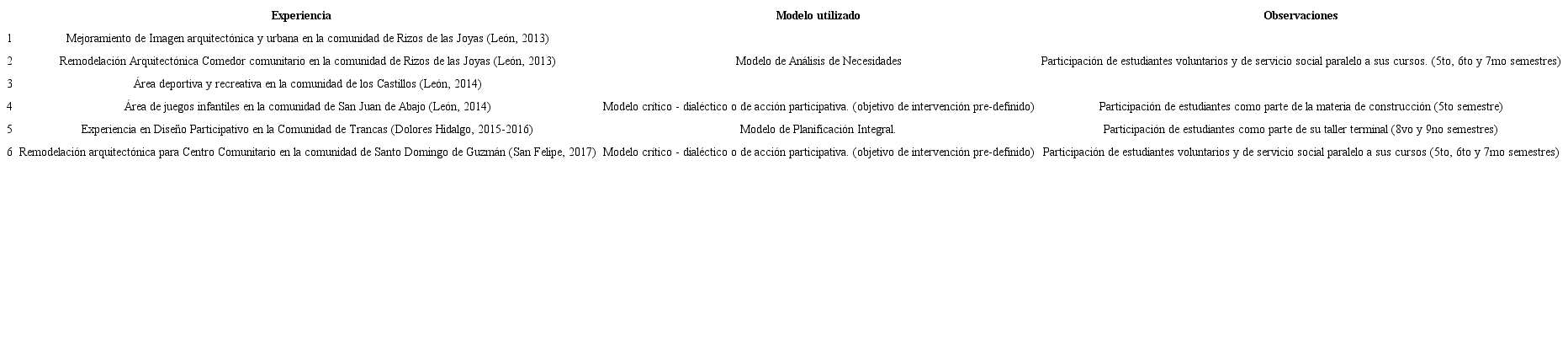 Basados en la premisa de que la mejora de la comunidad comienza con pequeñas acciones de intervención, se trabajaron distintos proyectos bajo la idea de que los habitantes no sólo aportan información básica de sus necesidades y aspiraciones; sino que también deben y pueden participar en soluciones viables y adecuadas para su entorno. En la Tabla 1 se presentan los proyectos y los modelos de desarrollo comunitario utilizados en cada una de las experiencias realizadas: